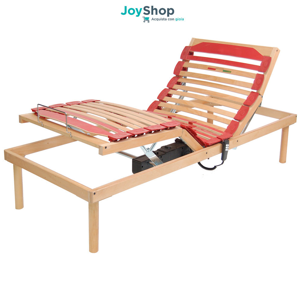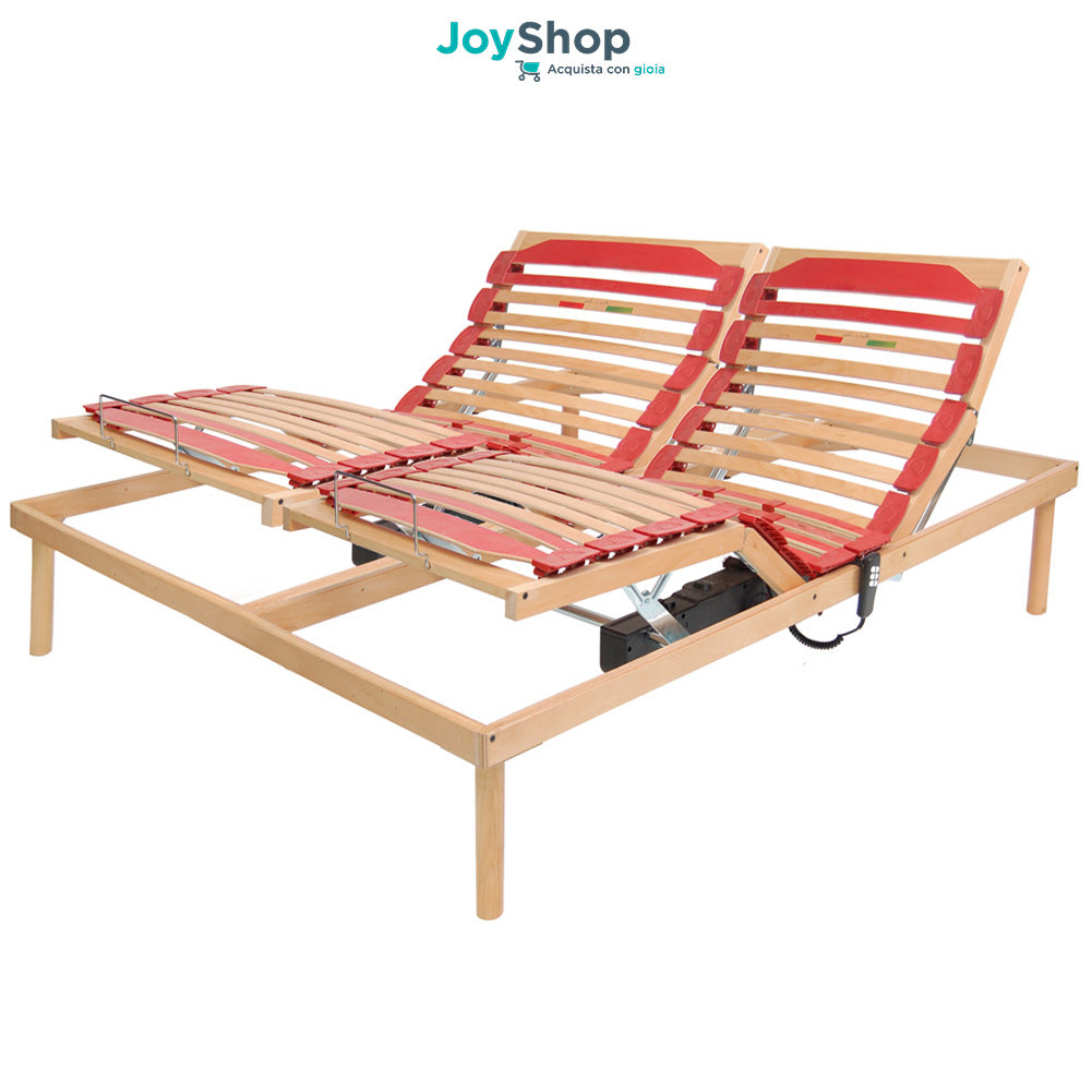 Rete ortopedica elettrica in faggio con movimento separato alta 40 cm dotata di ammortizzatori sui lati con lebs anti cigolio e regolatori di rigidità dorsale che permettono di variare tra un supporto letto più molleggiato, ad uno meno rigido rendendo la rete adatta ad ogni tipologia di materasso. La rete a doghe elettrica con poggia piedi e testa personalizzabile è realizzata in legno di faggio; assicurando una tenuta nel tempo estremamente più lunga, inoltre garantisce un supporto e una posizione corretta della colonna vertebrale durante il sonno.